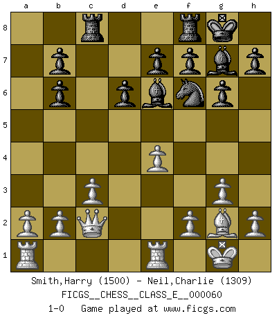 Last move : 1-0 2007 October 24 22:8:21 [Event "FICGS__CHESS__CLASS_E__000060"] [Site "FICGS"] [Date "2007.09.05"] [Round "1"] [White "Smith,Harry"] [Black "Neil,Charlie"] [Result "1-0"] [WhiteElo "1500"] [BlackElo "1309"] 1.e4 c5 2.Nf3 Nc6 3.g3 d6 4.Bg2 Nf6 5.d3 g6 6.O-O Bg7 7.Nbd2 Bg4 8.c3 Ne5 9.Qc2 Nxf3+ 10.Nxf3 O-O 11.d4 cxd4 12.Nxd4 Qb6 13.Be3 Rac8 14.Ne6 Bxe6 15.Bxb6 axb6 16.Rfe1 1-0 Sicilian defense Kingside Castling by player White (move 6) Kingside Castling by player Black (move 10) Player White won this chess game. Follow this game move after move (download)The only thing Chess players have in common is Chess. (Lodewijk Prins) Frage: Wie viele Autos haben Sie schon zerstört? - Antwort: Nur zwei. (Loek van Wely) Un entendimiento a fondo de las continuaciones típicas del mate, hace de las combinaciones de sacrificio mas complicadas conducirlas a ellas no solo sin dificultad, sino casi de una manera natural. (Siegbert Tarrasch) Soyez une menace à chaque fois que vous vous asseyez pour jouer. (Ken Smith) As the days dwindle down... to a precious few. (Maxwell Anderson)
