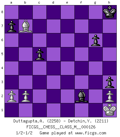 Last move : 1/2-1/2 2023 December 7 16:18:5 [Event "FICGS__CHESS__CLASS_M__000126"] [Site "FICGS"] [Date "2023.07.27"] [Round "1"] [White "Duttagupta,Aniruddha"] [Black "Detchin,Yra"] [Result "1/2-1/2"] [WhiteElo "2258"] [BlackElo "2211"] 1.d4 Nf6 2.c4 e6 3.Nf3 b6 4.g3 Ba6 5.Qc2 c5 6.d5 exd5 7.cxd5 Bb7 8.Bg2 Nxd5 9.O-O Be7 10.Rd1 Nc6 11.Qf5 Nf6 12.e4 g6 13.Qf4 O-O 14.e5 Nh5 15.Qc4 d5 16.exd6 Bxd6 17.Nc3 Na5 18.Qf1 Qb8 19.Nd5 Re8 20.Be3 Bf8 21.Ng5 Bg7 22.Rd2 h6 23.Ne4 Nc6 24.g4 Ne7 25.gxh5 Nxd5 26.hxg6 fxg6 27.Qc4 b5 28.Qxb5 Nxe3 29.fxe3 Bxe4 30.Qc4+ Kh8 31.Bxe4 Qe5 32.Bxa8 Qxe3+ 33.Rf2 Rf8 34.Raf1 Bd4 35.Qc2 h5 36.Bb7 h4 37.Kg2 h3+ 38.Kh1 Rxf2 39.Qxf2 Qxf2 40.Rxf2 Bxf2 1/2-1/2 Follow this game move after move (download)By playing at Chess then, we may learn: First: Foresight... Second: Circumspection... Third: Caution... And lastly, we learn by Chess the habit of not being discouraged by present bad appearances in the state of our affairs, the habit of hoping for a favorable chance, and that of persevering in the secrets of resources. (Benjamin Franklin) Schach ist die gewalttätigste aller Sportarten. (Garry Kasparov) La estratégia requiere pensar, la táctica requiere observación. (Max Euwe) Karpov est une pièce de musée. (Garry Kasparov) Now be brave and don't look back. Don't look back. (Shmi Skywalker in Star Wars ep.1)