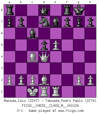 Last move : 0-1 2023 September 8 5:48:45 [Event "FICGS__CHESS__CLASS_M__000126"] [Site "FICGS"] [Date "2023.07.27"] [Round "1"] [White "Maceda,Coco"] [Black "Taboada,Pedro Pablo"] [Result "0-1"] [WhiteElo "2247"] [BlackElo "2274"] 1.e4 c5 2.Nf3 d6 3.d4 cxd4 4.Nxd4 Nf6 5.Nc3 Nc6 6.Bg5 e6 7.Qd2 Be7 8.O-O-O O-O 9.f4 Nxd4 10.Qxd4 Qa5 11.Bc4 Bd7 12.e5 dxe5 13.fxe5 Bc6 14.Bd2 Nd7 15.Nd5 Qd8 16.Rhe1 exd5 0-1 Follow this game move after move (download)Chess is a matter of delicate judgment, knowing when to punch and how to duck. (Bobby Fischer) Ich verlor meine Bürgerrechte, mein Gehalt wurde mir nicht mehr bezahlt und ich wurde zensiert und durfte nicht mehr ins Ausland reisen. [nach dem Match Fischer-Taimanov 6:0] (Mark Taimanov) Evita las multitudes. Haz independientemente tu propio razonamiento. Trata de ser el jugador de Ajedrez, no la pieza de Ajedrez. (Ralph Charell) La vie est comme un jeu d'échecs : nous esquissons un plan, mais celui-ci est tributaire de ce que daignent faire l'adversaire aux échecs et le destin dans la vie. (Arthur Schopenhauer) Do you know these so called Volunteers don't even get paid! (Simpsons)