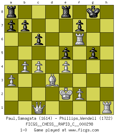 Last move : 1-0 2023 August 2 19:21:0 [Event "FICGS__CHESS__RAPID_C__000298"] [Site "FICGS"] [Date "2023.07.30"] [Round "1"] [White "Paul,Samagata"] [Black "Phillips,Wendell"] [Result "1-0"] [WhiteElo "1614"] [BlackElo "1722"] 1.e4 d6 2.d4 Nf6 3.Nc3 h6 4.h3 Nbd7 5.Nf3 e5 6.dxe5 dxe5 7.Bd3 c6 8.Be3 Be7 9.O-O Qc7 10.a3 Nf8 11.Ne2 Ng6 12.Ng3 O-O 13.b4 Re8 14.Bc4 Bd7 15.Bb3 Bf8 16.c4 Qc8 17.Qc2 Bd6 18.Rad1 Bc7 19.Rd3 Bxh3 20.gxh3 Qxh3 21.Rfd1 Ng4 22.Qc1 Nh4 23.Nxh4 Qxh4 24.Nf5 Qh2+ 25.Kf1 g6 26.Nxh6+ Nxh6 27.Bxh6 Qh1+ 28.Ke2 Qh5+ 29.Rf3 Qg4 30.Bc2 Bd8 31.Rg1 Qe6 32.Bd3 Bf6 33.Rfg3 Bg7 34.Rh1 Qf6 35.Rf3 Qe7 36.Bxg7 g5 37.Bf6 Qxf6 38.Rxf6 1-0 Follow this game move after move (download)Capture of the adverse King is the ultimate but not the first object of the game. (William Steinitz) Schach ist ein schwarz-weisser Dschungel. (Garry Kasparov) Desconfianza es la característica mas necesaria de un jugador de Ajedrez. (Siegbert Tarrasch) Nous vivons dans un monde échiquéen : chaque jour qui passe est un défi à relever. (Philosophe Sasha) Difficult things take a long time, impossible things a little longer. (Author unknown)