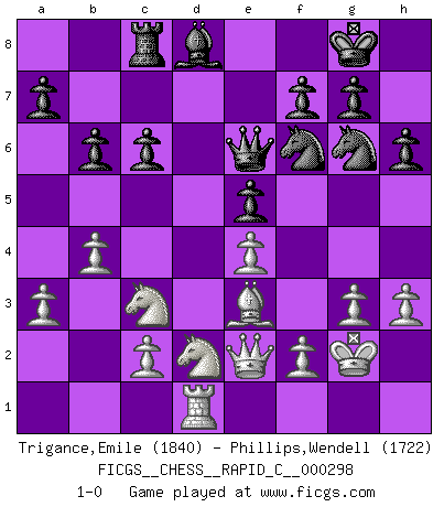 Last move : 1-0 2023 September 12 0:22:50 [Event "FICGS__CHESS__RAPID_C__000298"] [Site "FICGS"] [Date "2023.07.30"] [Round "1"] [White "Trigance,Emile"] [Black "Phillips,Wendell"] [Result "1-0"] [WhiteElo "1840"] [BlackElo "1722"] 1.e4 d6 2.d4 h6 3.Nc3 Nd7 4.Nf3 e5 5.dxe5 dxe5 6.Bc4 c6 7.O-O Be7 8.Qe2 Qc7 9.a3 Nf8 10.h3 Ng6 11.Rd1 Nf6 12.Be3 Bd7 13.Rd2 Qc8 14.Qf1 Be6 15.Rad1 O-O 16.Bxe6 Qxe6 17.g3 b6 18.Kg2 Rfd8 19.Rxd8+ Bxd8 20.b3 Be7 21.b4 Rc8 22.Qe2 Bd8 23.Nd2 1-0 Follow this game move after move (download)I'm not afraid of Spassky. The world knows I'm the best. You don't need a match to prove it. (Bobby Fischer) Ohne Fehler kann es keine Brillanz geben. (Emanuel Lasker) Aunque la mayoría de la gente disfruta observar las partidas de los grandes Maestros de ataque, algunos de los jugadores mas notables en la historia han sido los jugadores silenciosos posicionales. Lentamente ellos te aplastan despojandote de tu espacio, congestionando tus piezas y dejandote virtualmente sin nada que hacer. (Yasser Seirawan) Les réformistes prétendent que les progrès de la théorie conduiront à la disparition des échecs, et qu'il faut, pour leur rendre vie, en remanier les règles. En réalité, qu'exprime cette affirmation? Le mépris de l'intuition, de l'imagination et de tous les autres éléments qui font des échecs un art. (Alexander Alekhine) The Internet is the world's largest library. It's just that all the books are on the floor. (John Allen Paulos)