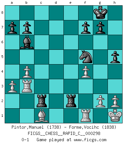 Last move : 0-1 2023 September 16 3:31:39 [Event "FICGS__CHESS__RAPID_C__000298"] [Site "FICGS"] [Date "2023.07.30"] [Round "1"] [White "Pintor,Manuel"] [Black "Forme,Vocihc"] [Result "0-1"] [WhiteElo "1738"] [BlackElo "1838"] 1.e4 c5 2.f4 e6 3.Nf3 d5 4.exd5 exd5 5.Bb5+ Nc6 6.O-O Bd6 7.d4 Nge7 8.c3 O-O 9.Bd3 Bf5 10.Ng5 cxd4 11.cxd4 Nxd4 12.Nc3 h6 13.Nf3 Nxf3+ 14.Qxf3 Bc5+ 15.Kh1 Re8 16.Bxf5 Nxf5 17.Qxd5 Qxd5 18.Nxd5 Rad8 19.Nc3 h5 20.Ne4 Rxe4 21.a3 Re2 22.b4 Bb6 23.Rb1 Rc8 24.Rb3 R8c2 0-1 Follow this game move after move (download)The beauty of a move lies not in its' appearance but in the thought behind it. (Siegbert Tarrasch) Wenn ich mich einlogge, glauben die Leute gewöhnlich nicht, dass ich es selbst bin und sie fangen an, mir dumme Fragen zu stellen. Und wenn sie es glauben, stellen sie wieder andere dumme Fragen. (Judith Polgar) Fischer es el jugador mas fuerte del mundo. De hecho, el jugador mas fuerte que jamas haya existido. (Larry Evans) Seul un grand joueur sait à quel point il joue faiblement. (Xavier Tartacover) Being number two sucks. (Andre Agassi)