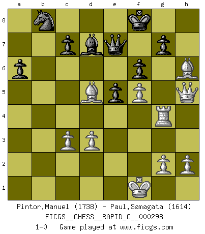 Last move : 1-0 2023 August 6 4:28:27 [Event "FICGS__CHESS__RAPID_C__000298"] [Site "FICGS"] [Date "2023.07.30"] [Round "1"] [White "Pintor,Manuel"] [Black "Paul,Samagata"] [Result "1-0"] [WhiteElo "1738"] [BlackElo "1614"] 1.e4 e5 2.f4 Nc6 3.Nf3 d6 4.Bc4 h6 5.O-O Nf6 6.d3 Be7 7.f5 a6 8.a4 O-O 9.Nh4 Nxe4 10.Ng6 Nf6 11.Nxf8 Kxf8 12.Nc3 d5 13.Ba2 d4 14.Ne4 b5 15.Nxf6 Bxf6 16.Qh5 Qe7 17.Rf3 bxa4 18.Bd5 Bd7 19.Rxa4 Rb8 20.c3 dxc3 21.bxc3 Rb1 22.Rf1 Nb8 23.Rg4 Bg5 24.Bxg5 Rxf1+ 25.Kxf1 f6 26.Bxh6 1-0 Follow this game move after move (download)At this time Fischer is simply a level above all the best Chessplayers in the world. (John Jacobs) Kasparov ist eine Art Monster mit hundert Augen, denen auch nicht das Geringste entgeht. (Tony Miles) Una buena memoria, concentración, imaginación y una fuerte voluntad, se requiere para llegar a ser un buen jugador. (Bobby Fischer) L'ordinateur a tué l'originalité. Il n'y a plus guère d'aventures sur l'échiquier. (Jacob Murray) Strategy without tactics is the slowest route to victory. Tactics without strategy is the noise before defeat. (Sun Tzu)