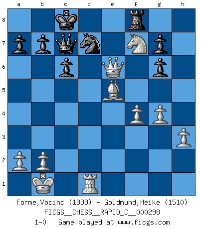 Last move : 1-0 2023 October 23 17:7:46 [Event "FICGS__CHESS__RAPID_C__000298"] [Site "FICGS"] [Date "2023.07.30"] [Round "1"] [White "Forme,Vocihc"] [Black "Goldmund,Heike"] [Result "1-0"] [WhiteElo "1838"] [BlackElo "1510"] 1.e4 d5 2.exd5 Qxd5 3.Nc3 Qa5 4.d4 Nf6 5.Bd2 c6 6.Bd3 Qc7 7.Nf3 Bg4 8.h3 Bh5 9.Qe2 e6 10.g4 Bg6 11.O-O-O Bd6 12.Bxg6 hxg6 13.Ne5 Nbd7 14.f4 Nb6 15.Kb1 Nfd5 16.Ne4 O-O-O 17.c4 Nf6 18.Nxd6+ Rxd6 19.c5 Rxd4 20.cxb6 Qxb6 21.Nxf7 Rf8 22.Qxe6+ Nd7 23.Bc3 Rxd1+ 24.Rxd1 Qc7 25.Be5 1-0 Follow this game move after move (download)The Chess pieces are the block alphabet which shapes thoughts; and these thoughts, although making a visual design on the chessboard, express their beauty abstractly, like a poem. (Marcel Duchamp) Ich bin es gewohnt, das die Jugend mir überhaupt keinen Respekt entgegenbringt. (Alexander Morozewich) El Ajedrez te enseña a controlarl la excitación inicial que sientes cuando vez algo que parece bueno y te enseña a pensar objetivamente cuando te encuentras en problemas. (Stanley Kubrick) Les échecs, c'est l'art d'analyser. (Mikhail Botvinnik) Work expands to fill the time available. (C. Northcote Parkinson, in Parkinson's Laws)
