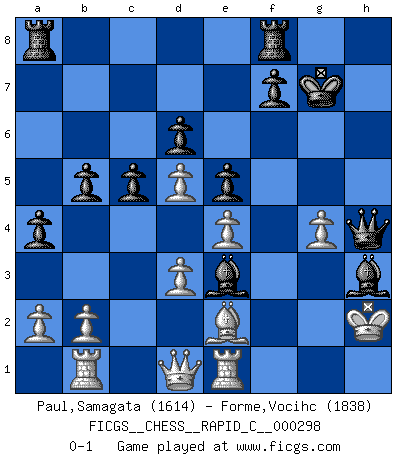 Last move : 0-1 2023 September 13 14:35:49 [Event "FICGS__CHESS__RAPID_C__000298"] [Site "FICGS"] [Date "2023.07.30"] [Round "1"] [White "Paul,Samagata"] [Black "Forme,Vocihc"] [Result "0-1"] [WhiteElo "1614"] [BlackElo "1838"] 1.e4 c5 2.c4 Nc6 3.Nf3 e5 4.Nc3 d6 5.h3 g6 6.Nd5 Bg7 7.d3 Nge7 8.Bg5 h6 9.Bxe7 Nxe7 10.Be2 O-O 11.Rb1 Nxd5 12.cxd5 b5 13.O-O Bd7 14.Qb3 a5 15.Rfc1 h5 16.Nh2 Bh6 17.Rf1 a4 18.Qd1 Kg7 19.g4 Bf4 20.gxh5 Bxh3 21.Re1 Qg5+ 22.Ng4 gxh5 23.f3 hxg4 24.fxg4 Be3+ 25.Kh2 Qh4 0-1 Follow this game move after move (download)By the beauty of his games, the clarity of his play, and the brilliance of his ideas, Fischer made himself an artist of the same stature as Brahms, Rembrandt, and Shakespeare. (David Levy) Wir können eben der zündenden Macht des Opfers nicht wiederstehen, denn die Begeisterung für das Opfer liegt in der Natur des Menschen. (Rudolf Spielmann) El Ajedrez es un juego terrible. Si no dominas el centro, tu oponente tiene una posición mas libre. Si tu tienes el centro, entonces realmente tienes algo de que preocuparte. (Siegbert Tarrasch) Toute estimation doit être constamment réévaluée. (Jacob Estrin) Animated gif is worth one mega-word. (Unknown)