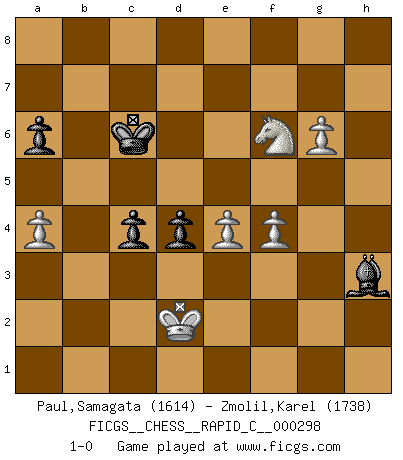 Last move : 1-0 2023 August 13 16:27:14 [Event "FICGS__CHESS__RAPID_C__000298"] [Site "FICGS"] [Date "2023.07.30"] [Round "1"] [White "Paul,Samagata"] [Black "Zmolil,Karel"] [Result "1-0"] [WhiteElo "1614"] [BlackElo "1738"] 1.e4 e5 2.Nf3 Nc6 3.Bc4 h6 4.a3 Nf6 5.Nc3 d6 6.h3 Ne7 7.d4 exd4 8.Nxd4 Ng6 9.O-O Ne5 10.Bb3 c5 11.Nde2 a6 12.Ng3 g6 13.Bf4 Nc6 14.Nce2 Be7 15.c3 Ne5 16.Qc2 Qc7 17.c4 Bd7 18.Rad1 O-O-O 19.Qd2 g5 20.Bxe5 dxe5 21.Qc2 Be6 22.Nc3 Rd4 23.Nd5 Qd6 24.Rxd4 exd4 25.Re1 Nd7 26.Ba4 Bd8 27.Rd1 Nb6 28.Bb3 Kb8 29.Ba2 Bd7 30.b3 Nc8 31.Rd3 g4 32.hxg4 Bxg4 33.b4 b6 34.bxc5 bxc5 35.Rb3+ Ka7 36.Qb2 Qc6 37.f3 Be6 38.a4 f6 39.Bb1 h5 40.Ne2 Rg8 41.Nef4 Bf7 42.Rb8 Nd6 43.Bd3 Nb7 44.Rxd8 Nxd8 45.Ne7 Qb7 46.Qxb7+ Kxb7 47.Nxg8 Bxg8 48.Nxh5 Nc6 49.Nxf6 Bf7 50.Kf2 Ne5 51.Ke2 Nxc4 52.Bxc4 Bxc4+ 53.Kd2 Bf1 54.g4 c4 55.g5 Bh3 56.g6 Kc6 57.f4 1-0 Follow this game move after move (download)What is the difference between chess and football? Everybody understands football, but nobody plays it. Everybody plays chess, but nobody understands it. Everything is relative. (Vladimir Kramnik) Capablanka war das größte Genie der Schachgeschichte! Aber denken sie nicht er habe nichts vom Schach verstanden. Er wusste nur soviel wie er wissen musste um seine Ziele zu erreichen. (Mikhail Moiseyevich Botvinik) ¿Cual es el objetivo de jugar una apertura de gambito?... Para adquirir una reputación de ser un jugador apuesto a costo de perder el juego. (Siegbert Tarrasch) L'action d'une oeuvre littéraire se déroule sur un champ de bataille. Les masques et les types du drame moderne correspondent aux pièces du jeu d'échecs. L'intrigue correspond aux coups et aux gambits, c'est à dire aux techniques du jeu telles qu'utilisées et interprétées par les joueurs. Les tactiques et les péripéties [mouvements] correspondent aux coups exécutés par l'adversaire. (Viktor Shklovsky) All maxims have their antagonist maxims; proverbs should be sold in pairs, a single one being but a half truth. (William Mathews)