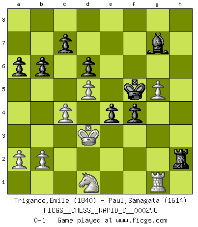 Last move : 0-1 2023 October 6 14:19:27 [Event "FICGS__CHESS__RAPID_C__000298"] [Site "FICGS"] [Date "2023.07.30"] [Round "1"] [White "Trigance,Emile"] [Black "Paul,Samagata"] [Result "0-1"] [WhiteElo "1840"] [BlackElo "1614"] 1.e4 e5 2.Nf3 Nc6 3.d4 Nf6 4.d5 Ne7 5.Nc3 d6 6.h3 h6 7.Be3 a6 8.Qd2 Ng6 9.g4 Be7 10.Be2 Bd7 11.g5 hxg5 12.Bxg5 Rxh3 13.O-O-O Rxh1 14.Rxh1 Bg4 15.Nh4 Bxe2 16.Nxg6 fxg6 17.Rh8+ Bf8 18.Qxe2 Qe7 19.Qe3 b6 20.Qh3 Qf7 21.Bxf6 gxf6 22.Rh7 Bg7 23.Ne2 Ke7 24.f4 Rg8 25.Qg4 f5 26.exf5 gxf5 27.Qg5+ Qf6 28.Ng3 Qxg5 29.fxg5 f4 30.Ne4 Kf7 31.Kd2 Kg6 32.Rh2 Kf5 33.Kd3 Kg4 34.Rh1 Rf8 35.Rg1+ Kf5 36.c4 Rh8 37.Nf2 Rh2 38.Nd1 e4+ 0-1 Follow this game move after move (download)Many Chess players were surprised when after the game, Fischer quietly explained: 'I had already analyzed this possibility' in a position which I thought was not possible to foresee from the opening. (Mikhail Tal) Rubinstein ist ein Turmendspiel, welches die Götter vor tausenden von Jahren begannen. (Savielly Grigorievitsch Tartakower) El Ajedrez es el juego mas altamente simbólico, pero las agresiones estan por lo tanto aún mas francamente representadas en la partida. Tal vez comenzo como un juego de guerra; Algo como la representación de una batalla en miniatura entre las fuerzas de dos reinos. (Karl Meninger) Le jeu d'échecs est comme rejeté hors du temps. (Antoine de Saint-Exupéry) For to win one hundred victories in one hundred battles is not the acme of skill. To subdue the enemy without fighting is the acme of skill. (Sun Tzu)