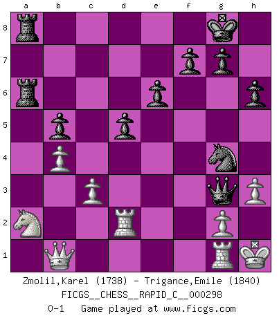 Last move : 0-1 2023 October 14 22:10:33 [Event "FICGS__CHESS__RAPID_C__000298"] [Site "FICGS"] [Date "2023.07.30"] [Round "1"] [White "Zmolil,Karel"] [Black "Trigance,Emile"] [Result "0-1"] [WhiteElo "1738"] [BlackElo "1840"] 1.e4 c5 2.Nf3 Nc6 3.Nc3 e6 4.d4 cxd4 5.Nxd4 d6 6.Be2 Nf6 7.O-O Be7 8.Nf3 O-O 9.h3 a6 10.Be3 b5 11.a3 Bb7 12.Nd4 Rc8 13.Nb3 h6 14.f4 Qc7 15.Bf3 Rfd8 16.Qe2 Rd7 17.Rad1 Rcd8 18.Qf2 Rc8 19.Rd2 Bd8 20.Rfd1 Ne8 21.Nd4 Ne7 22.Nde2 Qb8 23.Na2 Bc7 24.Nb4 Rcd8 25.e5 a5 26.Na2 Bxf3 27.Qxf3 d5 28.Nd4 Qb7 29.b4 axb4 30.axb4 Bb6 31.Nb3 Nf5 32.Bxb6 Qxb6+ 33.Nc5 Ra7 34.Qb3 Rda8 35.Ra1 Nc7 36.Kh2 Na6 37.Nxa6 Rxa6 38.c3 Qe3 39.Rad1 Qxf4+ 40.Kg1 Qxe5 41.Qb1 Qe3+ 42.Kh2 Qg3+ 43.Kh1 Ne3 44.Rg1 Ng4 0-1 Follow this game move after move (download)We must make sure that Chess will not be like a dead language, very interesting, but for a very small group. (Sytze Faber) Ja, jede Frau in Holland liebt mich bestimmt, und alle Männer hassen mich. (Loek van Wely) El Ajedrez es despiadado: debes de estar preparado para matar gente. (Nigel Short) Les erreurs sont comme les malheurs, elles n'arrivent jamais seules. (Siegbert Tarrasch) Methinks King Thibault should dub Marius Zubac a knight of the square board... I mean table, henceforth addressing him as Sir Marius, and bestow on him a suitable land from the kingdom of FICGS & marry him off to a worthy, fair maiden, lest he slice our heads with his mighty sword in his wrath. (Dinesh De Silva)