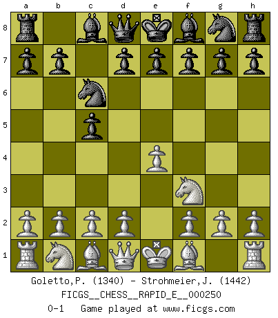 Last move : 0-1 2023 September 6 19:54:54 [Event "FICGS__CHESS__RAPID_E__000250"] [Site "FICGS"] [Date "2023.08.02"] [Round "1"] [White "Goletto,Piero Giuseppe"] [Black "Strohmeier,Josef"] [Result "0-1"] [WhiteElo "1340"] [BlackElo "1442"] 1.e4 c5 2.Nf3 Nc6 0-1 This chess game has been lost on time (started : 2023.08.02 13:22:19) Follow this game move after move (download)We cannot resist the fascination of sacrifice, since a passion for sacrifices is part of a Chessplayer's nature. (Rudolf Spielman) Schach ist das schnellste Spiel der Welt, weil man in jeder Sekunde Tausende von Gedanken ordnen muß. (Albert Einstein) Tu puedes aprender mucho mas de una partida que pierdas que de una partida ganada. Tendras que perder cientos de partidas antes de llegar a ser un buen jugador. (Jose Raul Capablanca) La vie et les Echecs sont tous les deux une lutte constante. (Lasker) May the force be with you. (Han Solo in Star Wars ep.4)