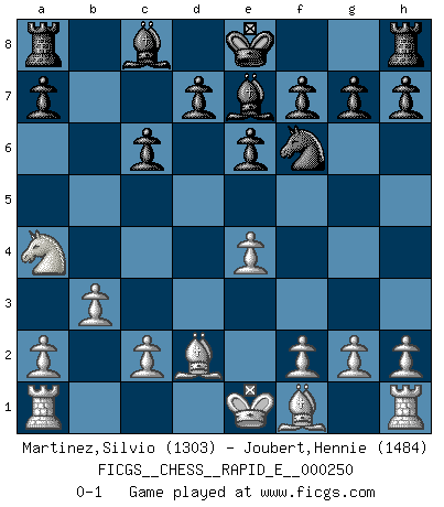 Last move : 0-1 2023 October 8 2:6:26 [Event "FICGS__CHESS__RAPID_E__000250"] [Site "FICGS"] [Date "2023.08.02"] [Round "1"] [White "Martinez,Silvio"] [Black "Joubert,Hennie"] [Result "0-1"] [WhiteElo "1303"] [BlackElo "1484"] 1.e4 c5 2.Nf3 e6 3.d4 cxd4 4.Nxd4 Nf6 5.Nc3 Qb6 6.Be3 Bc5 7.b3 Nc6 8.Nxc6 bxc6 9.Na4 Qa5+ 10.Qd2 Qxd2+ 11.Bxd2 Be7 0-1 This chess game has been lost on time (started : 2023.08.02 13:22:19) Follow this game move after move (download)After black's reply to 1.e4 with 1..e5, leaves him always trying to get into the game. (Howard Staunton) Der beste Spieler in einem Turnier gewinnt es nie. Er landet auf Platz zwei oder drei. (Siegbert Tarrasch) Una mala movida nulifica cuarenta buenas. (Horowitz) On entre au jeu d'Echecs comme on entre en Religion. Pour le joueur d'Echecs, la partie d'Echecs c'est l'office, la messe, le défilé du 1er Mai, le dépôt de gerbe au Monument aux Morts. C'est un drame sacré. (Michel Roos) Memory is a complicated thing, a relative to truth, but not its twin. (Barbara Kingsolver, Animal Dreams)