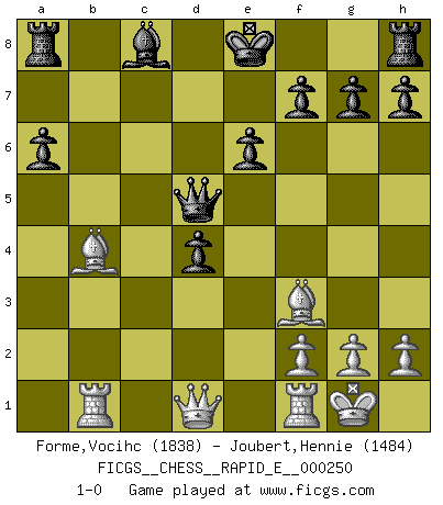 Last move : 1-0 2023 October 4 14:34:39 [Event "FICGS__CHESS__RAPID_E__000250"] [Site "FICGS"] [Date "2023.08.02"] [Round "1"] [White "Forme,Vocihc"] [Black "Joubert,Hennie"] [Result "1-0"] [WhiteElo "1838"] [BlackElo "1484"] 1.e4 c5 2.Nf3 e6 3.Nc3 Nc6 4.d4 cxd4 5.Nxd4 a6 6.Be2 Nf6 7.Nxc6 bxc6 8.e5 Nd5 9.Ne4 d6 10.Nxd6+ Bxd6 11.exd6 Qxd6 12.c4 Qb4+ 13.Bd2 Qxb2 14.cxd5 cxd5 15.Rb1 Qxa2 16.Bb4 d4 17.O-O Qd5 18.Bf3 1-0 Follow this game move after move (download)The essence of Chess is thinking about what Chess is. (David Bronstein) Dass jemand wie Surab Asmaiparaschwili, der selbst Elopunkte gekauft hat , Vize-Präsident der Fide werden konnte, sagt schon einges über den Zustand dieser Organisation aus. (Joel Lautier) Todo se encuentra en un estado de flujo y esto incluye al mundo del Ajedrez. (Mikhail Botvinnik) Roi des jeux et jeu des rois, les échecs portent en eux un sentiment d'infini. Ils donnent à celui qui s'est efforcé d'en approfondir les arcanes l'impression de n'être pas à la mesure de l'homme; en fait, ils constituent un résumé de l'univers, un microcosme, et figurent cette grande échelle qui, dans les plans de la lumière descend jusqu'à la matière, qui des abîmes insondables remonte jusqu'en l'infini de Dieu. (Pyrame) A good programmer is someone who always looks both ways before crossing a one-way street. (Doug Linder)