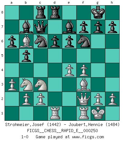 Last move : 1-0 2023 September 25 10:28:1 [Event "FICGS__CHESS__RAPID_E__000250"] [Site "FICGS"] [Date "2023.08.02"] [Round "1"] [White "Strohmeier,Josef"] [Black "Joubert,Hennie"] [Result "1-0"] [WhiteElo "1442"] [BlackElo "1484"] 1.e4 c5 2.Nf3 e6 3.d4 cxd4 4.Nxd4 Nf6 5.Nc3 Qb6 6.Nb3 Nc6 7.Be3 Qc7 8.Be2 a6 9.O-O d6 10.f4 Be7 11.Qd2 b5 12.a3 O-O 13.Rad1 Bb7 14.Bf3 Rac8 15.Qf2 Rfd8 16.Bb6 1-0 Follow this game move after move (download)He who fears an isolated Queen's Pawn should give up Chess. (Siegbert Tarrasch) Als er Schachweltmeister wurde ließ er praktisch alle stärksten Sovietspieler für sich arbeiten. Wenn ein auch nur mittelmässiger Meister ein Spezialist für eine bestimmte Eröffnung war, wurde er von Karpov gerufen. Das wurde alles geheim gehalten. (Mikhail Moiseyevich Botvinik) El Ajedrez es un expediente tonto que hace creer a la gente inactiva que hacen una cosa muy astuta cuando solamente estan perdiendo su tiempo. (George Bernard Shaw) Que feriez-vous si vous étiez en train de jouer aux échecs et que la fin du monde arrive ? Je continuerais à jouer. (Saint Borromée) Depression is just anger without enthusiasm. (Unknown)