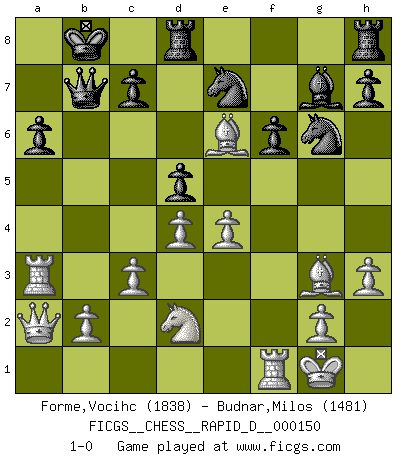 Last move : 1-0 2023 September 27 6:32:36 [Event "FICGS__CHESS__RAPID_D__000150"] [Site "FICGS"] [Date "2023.08.03"] [Round "1"] [White "Forme,Vocihc"] [Black "Budnar,Milos"] [Result "1-0"] [WhiteElo "1838"] [BlackElo "1481"] 1.e4 e5 2.Nf3 Nc6 3.Bb5 f6 4.O-O d6 5.d4 a6 6.Ba4 b5 7.Bb3 Bg4 8.c3 Nge7 9.a4 g5 10.h3 Bh5 11.Nxe5 Nxe5 12.Qxh5+ Ne5g6 13.f4 gxf4 14.Bxf4 Qd7 15.Nd2 O-O-O 16.Bg3 Bg7 17.axb5 Qxb5 18.Be6+ Kb8 19.Qd1 d5 20.Ra3 Qc6 21.Qb3+ Qb7 22.Qa2 1-0 Follow this game move after move (download)Chess is mental torture. (Garry Kasparov) Mein Name ist Rustam Kamsky. Sie haben meinen Sohn belästigt. Bereiten Sie sich aufs Sterben vor. (Rustam Kamsky) Realmente no sabemos como el juego fue inventado, aunque hay sospechas. Tan pronto como descubramos a los culpables, se los haremos saber. (Bruce Pandolfini) Demandez au pauvre Cg1 ce qu'il en pense. Eduard Gufeld à propos de la variante Saemisch de l'Est-Indienne. Winning isn't everything... but losing is nothing. (Mednis)
