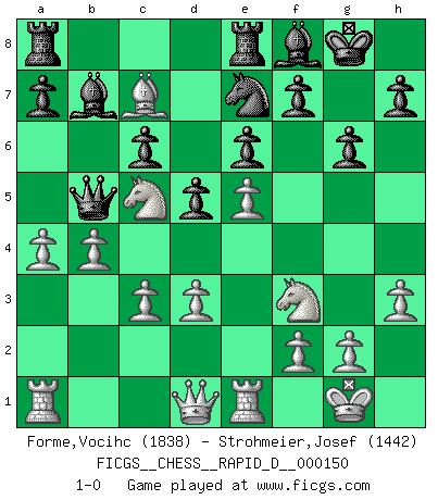 Last move : 1-0 2023 October 20 1:9:50 [Event "FICGS__CHESS__RAPID_D__000150"] [Site "FICGS"] [Date "2023.08.03"] [Round "1"] [White "Forme,Vocihc"] [Black "Strohmeier,Josef"] [Result "1-0"] [WhiteElo "1838"] [BlackElo "1442"] 1.e4 c5 2.Nf3 Nc6 3.Bb5 g6 4.Bxc6 bxc6 5.O-O Bg7 6.h3 Rb8 7.Re1 d6 8.e5 e6 9.d3 d5 10.Nc3 Qc7 11.Na4 Qa5 12.c3 Ne7 13.b3 O-O 14.Ba3 Re8 15.Bxc5 Bf8 16.b4 Qa6 17.Bd6 Ra8 18.Nc5 Qb5 19.Bc7 Bb7 20.a4 1-0 Follow this game move after move (download)Pawns: they are the soul of this game, they alone form the attack and defense. (Philidor) Glücklicherweise sind Großmeister Ruben Fines reine Schachbücher weniger phallozentrisch [als seine Schachpsychologie] und deswegen auch weniger lächerlich. (Nigel Short) Yo nunca en mi vida he jugado la Defensa Francesa, que viene siendo la más aburrida de todas las Aperturas. (Wilhelm Steinitz) Donnez-moi un Cavalier en 6e et je gagnerais toutes mes parties. (Steinitz) A generalist learns less and less about more and more until he knows nothing about everything. (Author unknown)