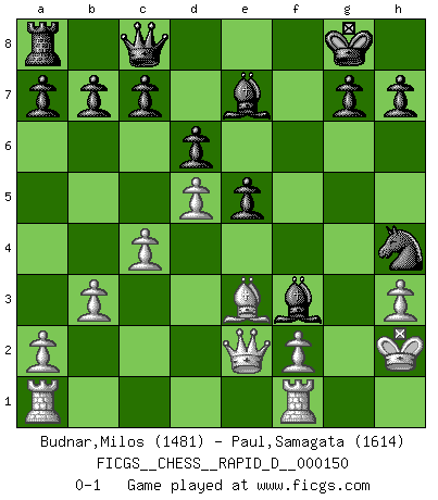 Last move : 0-1 2023 August 12 19:33:9 [Event "FICGS__CHESS__RAPID_D__000150"] [Site "FICGS"] [Date "2023.08.03"] [Round "1"] [White "Budnar,Milos"] [Black "Paul,Samagata"] [Result "0-1"] [WhiteElo "1481"] [BlackElo "1614"] 1.e4 e5 2.Nf3 Nc6 3.Bb5 d6 4.d4 Bd7 5.Bxc6 Bxc6 6.d5 Bb5 7.b3 Ne7 8.c4 Bd7 9.h3 Ng6 10.O-O Be7 11.Be3 O-O 12.Qd2 f5 13.exf5 Rxf5 14.g4 Rxf3 15.Qe2 Nh4 16.Kh2 Qc8 17.Nd2 Bxg4 18.Nxf3 Bxf3 0-1 Follow this game move after move (download)Chess, like love, is infectious at any age. (Flohr) Vielleicht wirkt die Aura früherer Spieler glanzvoller als die der heutigen Spieler, aber das liegt daran, dass man kein Programm wie Fritz hatte, das einem all die Löcher in ihren Partien zeigt. (Vladimir Kramnik) Debió haber existido una vez en que los hombres eran semidióses, de otra manera no hubiesen podido inventar el Ajedrez. (Gustav Schenk) Vouloir jouer aux échecs contre soi-même est aussi paradoxal que vouloir marcher sur son ombre. (Stefan Zweig) Whoever said the pen is mightier than the sword obviously never encountered automatic weapons. (US General Douglas MacArthur)