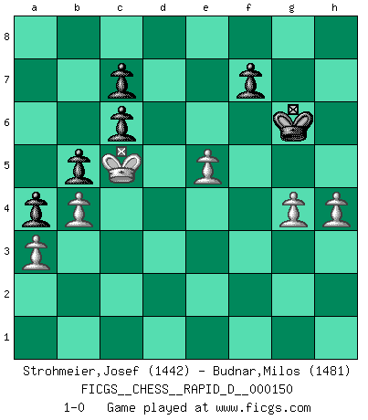 Last move : 1-0 2023 October 17 19:55:23 [Event "FICGS__CHESS__RAPID_D__000150"] [Site "FICGS"] [Date "2023.08.03"] [Round "1"] [White "Strohmeier,Josef"] [Black "Budnar,Milos"] [Result "1-0"] [WhiteElo "1442"] [BlackElo "1481"] 1.e4 e5 2.Nf3 Nc6 3.Bb5 Bd6 4.O-O Nf6 5.Re1 O-O 6.c3 a6 7.Bxc6 dxc6 8.d4 Bg4 9.Qd3 h6 10.h3 Bxf3 11.Qxf3 Nh7 12.Qg3 exd4 13.e5 Be7 14.Bxh6 Bg5 15.Bxg5 Qxg5 16.Qxg5 Nxg5 17.cxd4 Rad8 18.Rd1 Ne6 19.Nc3 Rxd4 20.Rxd4 Nxd4 21.Re1 Ne6 22.g3 b5 23.a3 a5 24.b4 a4 25.f4 g6 26.Ne4 Kg7 27.Rd1 Rd8 28.Rxd8 Nxd8 29.Kf2 Ne6 30.Ke3 Kh6 31.g4 g5 32.fxg5+ Nxg5 33.Nxg5 Kxg5 34.Ke4 Kg6 35.h4 Kg7 36.Kd4 Kg6 37.Kc5 1-0 Follow this game move after move (download)When I asked Fischer why he had not played a certain move in our game, he replied: 'Well, you laughed when I wrote it down !' (Mikhail Tal) Ich war schon mal beim Dopingtest. Da musste ich Urin abgeben, während Dritte zusahen. (Elisabeth Pähtz) Fischer sacrificó virtualmente todo lo que la mayoría de nosotros los 'debiles' (término que él usa) valoramos, respetamos y apreciamos por el amor de un astuto, a menudo hermoso tablero de juego, por el privilegio ambivalente de ser su mas grande maestro. (Paul Kollar) Nous sommes les pions de la mystérieuse partie d'Echecs jouée par Dieu. Il nous déplace, nous arrête, nous pousse encore, puis nous lance un à un dans la boîte du Néant. Epitaphe sur la tombe de David Janowsky (1868-1927). To err is human, but to really foul things up requires a computer. (Farmer's Almanac, 1978)