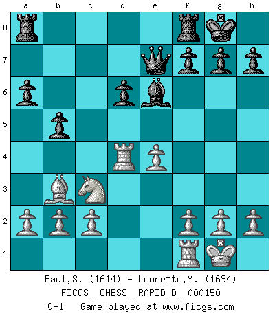 Last move : 0-1 2023 August 5 17:40:32 [Event "FICGS__CHESS__RAPID_D__000150"] [Site "FICGS"] [Date "2023.08.03"] [Round "1"] [White "Paul,Samagata"] [Black "Leurette,Marc-Antoine"] [Result "0-1"] [WhiteElo "1614"] [BlackElo "1694"] 1.e4 e5 2.Nf3 Nc6 3.Bc4 Nf6 4.d4 exd4 5.Bg5 Be7 6.Nxd4 Nxd4 7.Qxd4 O-O 8.Nc3 d6 9.O-O a6 10.Rad1 b5 11.Bb3 c5 12.Bxf6 cxd4 13.Bxe7 Qxe7 14.Rxd4 Be6 0-1 Follow this game move after move (download)White lost because he failed to remember the right continuation and had to think up the moves himself. (Siegbert Tarrasch) Frage des Reporters: -Welche besonderen Umstände rechtfertigen das Anhalten der Uhren während einer Turnierpartie? Antwort: -Einen Fotographen zu strangulieren. (Siegbert Tarrasch) Cuando tengo las piezas blancas, yo gano porque soy blanco; Cuando tengo las piezas negras, yo gano porque soy Bogolyubov. (Bogolyubov) Le succès, c'est être capable d'aller d'échec en échec sans perdre son enthousiasme. (Winston Churchill) The only thing that matters is the evidence. (Horatio Caine, C.S.I. Miami)