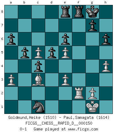 Last move : 0-1 2023 September 2 10:56:5 [Event "FICGS__CHESS__RAPID_D__000150"] [Site "FICGS"] [Date "2023.08.03"] [Round "1"] [White "Goldmund,Heike"] [Black "Paul,Samagata"] [Result "0-1"] [WhiteElo "1510"] [BlackElo "1614"] 1.b4 e5 2.Bb2 d6 3.a3 Nf6 4.e3 Be7 5.c4 O-O 6.Be2 Be6 7.Nf3 Nc6 8.d3 h6 9.O-O a6 10.Nbd2 b5 11.Qc2 Qd7 12.Nb3 Nh7 13.d4 d5 14.dxe5 dxc4 15.Rfd1 Qc8 16.Nc5 Bxc5 17.bxc5 Ne7 18.Nd4 Nd5 19.Nxe6 fxe6 20.Qe4 Ng5 21.Qg6 Qe8 22.Qxe8 Raxe8 23.Bd4 c6 24.h4 Ne4 25.Rac1 Nxf2 26.Rf1 Ne4 27.Bf3 Nd2 28.Rf2 Nb3 29.Bxd5 cxd5 30.Bc3 Nxc1 0-1 Follow this game move after move (download)If your opponent cannot do anything active, then don't rush the position; instead you should let him sit there, suffer, and beg you for a draw. (Jeremy Silman) Wenn Spassky eine Figur opfert kannst du genauso gut aufgeben. Aber wenn Tal eine Figur opfert, spiel weiter. Er könnte noch eine weitere opfern, und dann ... wer weiß? (Miguel Najdorf) Nunca antes ha habido un jugador de Ajedrez con tal conocimiento a fondo de las complejidades del juego y una inmensa voluntad absolutamente indomable de ganar. Yo pienso que Fischer es el jugador mas grande que jamás haya existido. (Lisa Lane) J'apprécie les joueurs d'est-indienne, c'est grâce à eux que je nourris ma famille depuis tant d'années. (Petrosian) We need strong personalities and only one world champion to attract sponsors. (Anatoly Karpov)