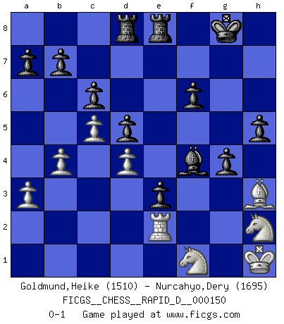 Last move : 0-1 2023 December 11 4:54:18 [Event "FICGS__CHESS__RAPID_D__000150"] [Site "FICGS"] [Date "2023.08.03"] [Round "1"] [White "Goldmund,Heike"] [Black "Nurcahyo,Dery"] [Result "0-1"] [WhiteElo "1510"] [BlackElo "1695"] 1.b4 f6 2.Bb2 e5 3.a3 d5 4.e3 Nh6 5.c4 Be6 6.Qc2 Bf5 7.d3 c6 8.Nd2 Nd7 9.Ngf3 Be7 10.Be2 Be6 11.O-O O-O 12.Rfd1 Re8 13.Bf1 Nf8 14.h3 Rc8 15.Rac1 Qd7 16.c5 Ng6 17.d4 e4 18.Nh2 Nf7 19.Be2 Nh6 20.Rf1 Bxh3 21.gxh3 Qxh3 22.Kh1 Bd8 23.Rg1 Bc7 24.Rg2 Nh4 25.Rcg1 Nxg2 26.Rxg2 Rcd8 27.f4 Qxe3 28.Ndf1 Qxf4 29.Bc1 Qh4 30.Be3 Nf5 31.Bf2 Qh6 32.Bg4 Nh4 33.Bxh4 Qxh4 34.Qe2 g6 35.Qe3 g5 36.Bf5 Bf4 37.Qh3 Qxh3 38.Bxh3 h5 39.Rf2 e3 40.Re2 g4 0-1 This chess game has been lost on time (started : 2023.08.03 23:43:55) Follow this game move after move (download)Before the endgame, the Gods have placed the middle game. (Siegbert Tarrasch) Die jungen Leute sollen verstehen, dass sie noch etwas von mir lernen können und müssen. (Viktor Kortschnoi) Aún deseo matar a Fischer. (Boris Spassky) Tout change constamment, y compris dans le monde des Echecs. (Botvinnik) Strategy without tactics is the slowest route to victory. Tactics without strategy is the noise before defeat. (Sun Tzu)