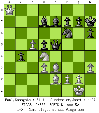 Last move : 1-0 2023 October 1 9:0:13 [Event "FICGS__CHESS__RAPID_D__000150"] [Site "FICGS"] [Date "2023.08.03"] [Round "1"] [White "Paul,Samagata"] [Black "Strohmeier,Josef"] [Result "1-0"] [WhiteElo "1614"] [BlackElo "1442"] 1.e4 c5 2.Nf3 Nc6 3.c3 Nf6 4.d3 d6 5.h3 e6 6.Be2 Be7 7.O-O O-O 8.Be3 Qc7 9.Nbd2 Bd7 10.a3 b5 11.b4 cxb4 12.axb4 a5 13.bxa5 Rxa5 14.c4 b4 15.Qb3 Rfa8 16.Qb2 Rxa1 17.Rxa1 Rxa1+ 18.Qxa1 h6 19.Qa8+ Kh7 20.Nb3 d5 21.exd5 exd5 22.c5 Ne5 23.Nxe5 Qxe5 24.Nd4 1-0 This chess game has been lost on time (started : 2023.08.03 23:43:55) Follow this game move after move (download)When you are lonely, when you feel yourself an alien in the world, play Chess. This will raise your spirits and be your counselor in war. (Aristotle) Wie bekannt hörte Morphy 1859 auf, Schach zu spielen. Seine Enttäuschung galt nicht so sehr dem Schach, wie den Schachspielern. (Robert James Fischer) El Ajedrez no es como la vida... ¡tiene reglas!. (Mark Pasternak) On peut tirer plus d'utilité d'une partie perdue que de 100 parties gagnées. (Capablanca) Without deviation from the norm, progress is not possible. (Frank Zappa)