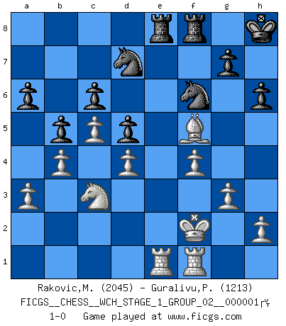 Last move : 1-0 2006 September 3 12:17:49 [Event "FICGS__CHESS__WCH_STAGE_1_GROUP_02__000001 "] [Site "FICGS"] [Date "2006.07.01"] [Round "1"] [White "Rakovic,Miroslav"] [Black "Guralivu,Paul-Iosif"] [Result "1-0"] [WhiteElo "2045"] [BlackElo "1213"] 1.c4 Nf6 2.g3 e5 3.Bg2 Bc5 4.Nc3 O-O 5.a3 a6 6.e3 c6 7.Nge2 d5 8.d4 exd4 9.exd4 Bb6 10.c5 Bc7 11.O-O Bg4 12.f3 Be6 13.Bg5 Nbd7 14.Qc2 h6 15.Bf4 Bxf4 16.Nxf4 b6 17.b4 Qb8 18.Nxe6 fxe6 19.f4 b5 20.Bh3 Qe8 21.Rae1 Qh5 22.Bxe6+ Kh8 23.Qf5 Qxf5 24.Bxf5 Rae8 25.Kf2 1-0 English, 1...Nf6 (Anglo-Indian defense) Kingside Castling by player Black (move 4) Kingside Castling by player White (move 11) Player White won this chess game. Follow this game move after move (download)Blessed be the memory of him who gave the world this immortal game. (A. G. Gardiner) Ich verstehe den Grund nicht, warum die Aufteilung in Frauen und Männer überhaupt im Schach besteht. (Judith Polgar) En el tablero, la mentira e hipocresía no sobreviven mucho. (Emanuel Lasker) Shah mat. Le roi est mort. Cri de fierté d'un joueur venant de terrasser son adversaire, courtoisement, sans effusion de sang. Real knowledge is to know the extent of one's ignorance. (Confucius)