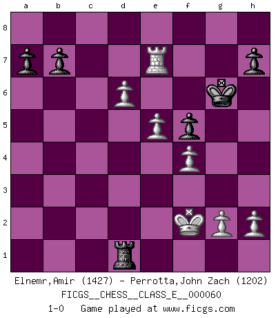 Last move : 1-0 2008 May 2 21:6:7 [Event "FICGS__CHESS__CLASS_E__000060"] [Site "FICGS"] [Date "2007.09.05"] [Round "1"] [White "Elnemr,Amir"] [Black "Perrotta,John Zach"] [Result "1-0"] [WhiteElo "1427"] [BlackElo "1202"] 1.e4 c5 2.Nf3 Nc6 3.Bb5 g6 4.c3 Bg7 5.d4 cxd4 6.cxd4 Qb6 7.Bxc6 Qxc6 8.Nc3 Nf6 9.Qd3 d5 10.e5 Ne4 11.Ng5 Nxg5 12.Bxg5 Bf5 13.Qf3 Qb6 14.Qxd5 Qxb2 15.Qb5+ Qxb5 16.Nxb5 O-O 17.Bxe7 Rfc8 18.Nd6 Rc2 19.Nxf5 gxf5 20.O-O Rd2 21.Rfd1 Rc2 22.f4 Rac8 23.Bh4 Rb2 24.Rac1 R8c2 25.Rxc2 Rxc2 26.Be7 Rxa2 27.d5 Bf8 28.d6 f6 29.Bxf6 Kf7 30.Rc1 Rd2 31.Rc7+ Kg6 32.Be7 Rd1+ 33.Kf2 Bxe7 34.Rxe7 1-0 Sicilian : Nimzovich-Rossolimo attack (with ...g6, without ...d6) Kingside Castling by player Black (move 16) Kingside Castling by player White (move 20) Player White won this chess game. Follow this game move after move (download)Every Chess master was once a beginner. (Chernev) Bis zum Jahr 1971 verlief in meiner Schachkariere alles glatt. Dieses dramatische Match [Fischer-Taimanov 6:0] machte mein Leben zur Hölle. (Mark Taimanov) El ganar no lo es todo... pero el perder es nada. (Mednis) Le thème de l'attaque double intervient d'une manière ou d'une autre dans l'immense majorité des combinaisons. (Youri Averbakh) A cynic is a man who knows the price of everything but the value of nothing. (Oscar Wilde)