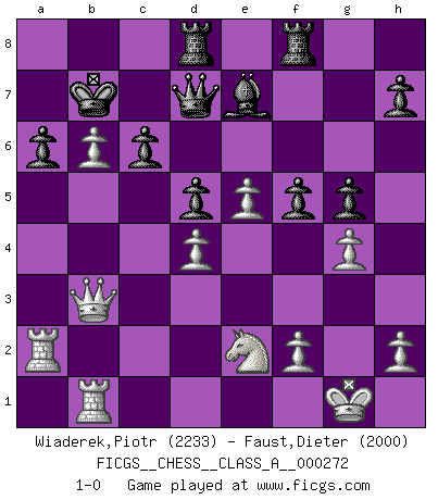 Last move : 1-0 2023 October 6 7:31:39 [Event "FICGS__CHESS__CLASS_A__000272"] [Site "FICGS"] [Date "2023.08.10"] [Round "1"] [White "Wiaderek,Piotr"] [Black "Faust,Dieter"] [Result "1-0"] [WhiteElo "2233"] [BlackElo "2000"] 1.d4 d5 2.c4 dxc4 3.e4 Nf6 4.e5 Nd5 5.Bxc4 Nb6 6.Bd3 Nc6 7.Ne2 Be6 8.Nbc3 Qd7 9.Ne4 Bd5 10.O-O O-O-O 11.a4 Bxe4 12.Bxe4 Nd5 13.b4 Ncxb4 14.a5 f5 15.Bf3 e6 16.Qb3 Be7 17.Bd2 g5 18.Rfb1 c6 19.Bxb4 Nxb4 20.g4 Rhf8 21.Ra4 Nd5 22.Bxd5 exd5 23.Ra2 a6 24.Rab2 b5 25.axb6 Kb7 26.Ra2 1-0 Follow this game move after move (download)Capture of the adverse King is the ultimate but not the first object of the game. (William Steinitz) Die Auseinandersetzung mit Karpow war politisch geprägt. Er stand für das kommunistische System, wurde von dessen Repräsentanten gehätschelt. Ich war der Oppositionelle. Jeder Schachweltmeister spiegelt auch die gesellschaftlichen Verhältnisse wider. Kramnik steht für die Börsen-Generation des Neuen Markts, ideologiefrei, zahlenfixiert. (Garry Kasparov) La vida es como un juego de Ajedrez, cambiando con cada movimiento. (Proverbio Chino) Un journaliste : 'Vous préférez avoir une dame de plus sur l'échiquier ou au lit ?' Boris Spassky : 'Ca dépend de la position.' Warrior pose battles inner weakness and wins focus. You see that there is no war within you. You're on your own side, and you are your own strength. (Terri Guillemets)