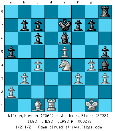 Last move : 1/2-1/2 2023 September 30 8:25:16 [Event "FICGS__CHESS__CLASS_A__000272"] [Site "FICGS"] [Date "2023.08.10"] [Round "1"] [White "Wilson,Norman"] [Black "Wiaderek,Piotr"] [Result "1/2-1/2"] [WhiteElo "2060"] [BlackElo "2233"] 1.e4 e5 2.Nf3 Nc6 3.Bb5 Nf6 4.O-O Nxe4 5.d4 Nd6 6.Bxc6 dxc6 7.dxe5 Nf5 8.Qxd8+ Kxd8 9.h3 Ke8 10.Nc3 h6 11.Bf4 Bb4 12.Ne4 Be6 13.c3 Be7 14.b3 Rd8 15.g4 Nh4 16.Nxh4 Bxh4 17.Rad1 Rxd1 18.Rxd1 Ke7 19.c4 h5 20.f3 a5 21.Bc1 1/2-1/2 Follow this game move after move (download)A chess genius has died; a loss for humanity. (Viktor Kortchnoi, about Bobby Fischer's death) Ich moechte nie einem Club beitreten, der Leute wie mich als Mitglieder aufnimmt. (Woody Allen) Una clavada es mas poderosa que una espada. (Fred Reinfeld) Toutes les manuvres exécutées sur une colonne ouverte ont pour but ultime l'intrusion définitive sur la septième ou la huitième rangée, en plein cur de la position ennemie. (Aaron Nimzovitch) Rules and bones are meant to be broken. (Anonymous)