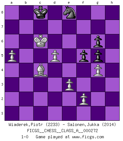 Last move : 1-0 2023 December 12 8:31:58 [Event "FICGS__CHESS__CLASS_A__000272"] [Site "FICGS"] [Date "2023.08.10"] [Round "1"] [White "Wiaderek,Piotr"] [Black "Salonen,Jukka"] [Result "1-0"] [WhiteElo "2233"] [BlackElo "2014"] 1.d4 d5 2.c4 c6 3.Nf3 Nf6 4.e3 Bf5 5.Nc3 e6 6.Nh4 Bg6 7.Nxg6 hxg6 8.Bd2 Nbd7 9.Qb3 Qc7 10.cxd5 exd5 11.O-O-O O-O-O 12.h3 Be7 13.Kb1 Kb8 14.Bd3 Nf8 15.Rc1 Ne6 16.Rhd1 Qh2 17.Na4 Ka8 18.Ba5 Rd7 19.Nb6+ axb6 20.Bxb6 Kb8 21.Qa4 Nc7 22.b4 Bxb4 23.Ba7+ Ka8 24.Bc5 Kb8 25.Qa7+ Kc8 26.Bxb4 Ne4 27.Rc2 Nd6 28.g3 Qxh3 29.Bxd6 Rxd6 30.Rb2 Kd7 31.Rxb7 Rc8 32.Rc1 Qh8 33.Qb6 Qd8 34.a4 Ke6 35.Rxc6 Ne8 36.Qxd8 Rcxd8 37.Rc5 R8d7 38.Rxd7 Rxd7 39.a5 Rc7 40.Rxc7 Nxc7 41.Kb2 Kd6 42.Ka3 Kc6 43.Ka4 g5 44.g4 f6 45.Kb4 Ne6 46.Bb5+ Kb7 47.Be8 Ka6 48.Bc6 Nc7 49.Bd7 g6 50.Bc8+ Ka7 51.Kc5 Kb8 52.Bd7 Ka7 53.Kd6 Kb7 54.Bc6+ Kb8 55.Bxd5 Kc8 56.Bc4 f5 57.Kc6 Ne8 58.d5 1-0 Follow this game move after move (download)I'm not afraid of Spassky. The world knows I'm the best. You don't need a match to prove it. (Bobby Fischer) Es gibt nur zwei wahre Schachgenies - das andere war Wilhelm Steinitz, der Weltmeister von 1872 bis 1894. (Robert James Fischer) El Ajedrez es realmente noventa y nueve por ciento calculación. (Soltis) Assurément je connaissais par expérience le mystérieux attrait de ce jeu royal, le seul entre tous les jeux inventés par les hommes qui échappe souverainement à la tyrannie du hasard, le seul où l'on ne doive sa victoire qu'à son intelligence ou plutôt à une certaine forme d'intelligence. Mais n'est-ce pas déjà le limiter injurieusement que d'appeler les échecs un jeu ? N'est-ce pas une science, un art ou quelque chose qui, comme le cercueil de Mahomet entre ciel et terre, est suspendu entre l'un et l'autre, et qui réunit un nombre incroyable de contraires ? [...] C'est une pensée qui ne mène à rien, une mathématique qui n'établit rien, un art qui ne laisse pas d'uvre, une architecture sans matière; et il l'a prouvé néanmoins qu'il était plus durable, à sa manière, que les livres ou que tout autre monument, ce jeu unique qui appartient à tous les peuples et à tous les temps, et dont personne ne sait quel dieu en fit don à la terre pour tuer l'ennui, pour aiguiser l'esprit et stimuler l'âme. Où commence-t-il, où finit-il ? (Stefan Zweig) The message for business people contemplating their place in the cyberspace is simple and direct: get linked or get lost. (Vic Sussman and Kenan Pollack)