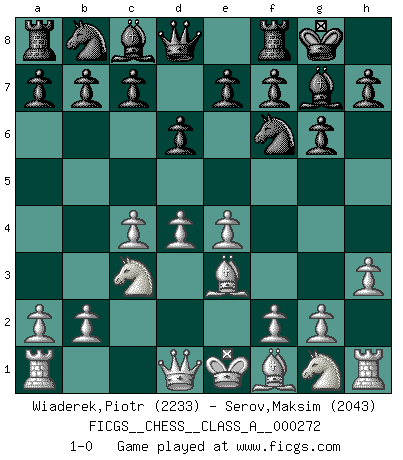 Last move : 1-0 2023 October 1 9:0:13 [Event "FICGS__CHESS__CLASS_A__000272"] [Site "FICGS"] [Date "2023.08.10"] [Round "1"] [White "Wiaderek,Piotr"] [Black "Serov,Maksim"] [Result "1-0"] [WhiteElo "2233"] [BlackElo "2043"] 1.d4 Nf6 2.c4 g6 3.Nc3 Bg7 4.e4 d6 5.h3 O-O 6.Be3 1-0 This chess game has been lost on time (started : 2023.08.10 11:17:37) Follow this game move after move (download)In Chess, just as in life, today's bliss may be tomorrow's poison. (Assaic) Es gibt keine einzige Frau, der ich nicht einen Springer vorgeben könnte und trotzdem gewänne. (Robert James Fischer) Me dio la sensación de como si yo estuviera jugando en contra del mismo Ajedrez. - al estar jugando en contra de Robert Fischer (Walter Shipman) Lorsque vous vous retrouvez devant une position atroce, ne tendez pas un ultime piège dérisoire avec l'intention d'abandonner si l'adversaire le déjoue ! Faites-vous plutôt un devoir de résister comme si votre vie en dépendait. Jouez le coup qui vous déplairait au centuple si vous étiez dans la peau de votre tortionnaire ! Fear is the path to the dark side. Fear leads to anger; anger leads to hate; hate leads to suffering. I sense much fear in you. (Master Yoda in Star Wars ep.1)