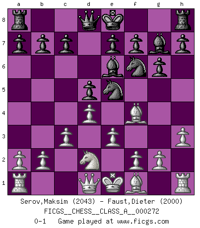 Last move : 0-1 2023 September 25 6:21:30 [Event "FICGS__CHESS__CLASS_A__000272"] [Site "FICGS"] [Date "2023.08.10"] [Round "1"] [White "Serov,Maksim"] [Black "Faust,Dieter"] [Result "0-1"] [WhiteElo "2043"] [BlackElo "2000"] 1.d4 d5 2.Nf3 Nf6 3.Bf4 Bg4 4.Ne5 Be6 5.e3 Nbd7 6.Nd2 g6 7.c3 Bg7 8.h3 Nxe5 0-1 This chess game has been lost on time (started : 2023.08.10 11:17:37) Follow this game move after move (download)By this measure (on the gap between Fischer & his contemporaries), I consider him the greatest world champion. (Garry Kasparov) Wer mein Gambit spielt, muß bereit sein, alle Brücken hinter sich abzubrechen. Es verändert den ganzen Menschen. Es wirkt wie ein Zauberstab und fördert verkümmerte, gute Charakter- eigenschaften wieder zu Tage. (Emil Joseph Diemer) Nunca antes ha habido un jugador de Ajedrez con tal conocimiento a fondo de las complejidades del juego y una inmensa voluntad absolutamente indomable de ganar. Yo pienso que Fischer es el jugador mas grande que jamás haya existido. (Lisa Lane) Toute estimation doit être constamment réévaluée. (Jacob Estrin) The best teachers teach from the heart, not from the book. (Author unknown)