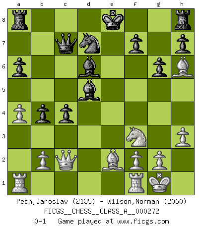 Last move : 0-1 2023 November 11 0:23:32 [Event "FICGS__CHESS__CLASS_A__000272"] [Site "FICGS"] [Date "2023.08.10"] [Round "1"] [White "Pech,Jaroslav"] [Black "Wilson,Norman"] [Result "0-1"] [WhiteElo "2135"] [BlackElo "2060"] 1.d4 d5 2.c4 e6 3.Nc3 c6 4.Nf3 Nf6 5.e3 Nbd7 6.Qc2 Bd6 7.Bd3 dxc4 8.Bxc4 b5 9.Bd3 a6 10.O-O Bb7 11.e4 e5 12.h3 exd4 13.Nxd4 g6 14.Bh6 c5 15.Nf3 c4 16.Be2 Qc7 17.a4 b4 18.Nd5 Nxd5 19.exd5 Bxd5 0-1 This chess game has been lost on time (started : 2023.08.10 11:17:37) Follow this game move after move (download)The stomach is an essential part of the Chess master. (Bent Larsen) Über Kasparov: Es ist offensichtlich, daß er in einem totalitären Staat aufwuchs und deshalb zu diktatorischen Zügen neigt. (Viktor Kortschnoi) ¿Porque tengo que perder ante este idiota?. (Aron Nimzovich) C'est une question de caractère, Beaucoup de gens perdent leur motivation très vite. D'autres, ils sont rares, peuvent la conserver très longtemps. J'aime les échecs, encore aujourd'hui je suis heureux d'analyser des parties. J'aime toujours gagner, je déteste encore perdre. Bien jouer est important pour mon intégrité intellectuelle et morale. Et puis les échecs vivent en ce moment une période historique grâce à Internet. Ils se développent dans les systèmes éducatifs à travers le monde. Ils sortent de leur ghetto, et c'est mon rôle de mener à bien cette révolution. (Gary Kasparov) It's unlucky to be superstitious. (Dave Enteles)