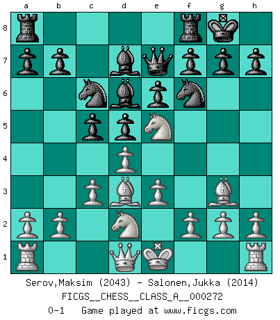 Last move : 0-1 2023 September 23 12:41:41 [Event "FICGS__CHESS__CLASS_A__000272"] [Site "FICGS"] [Date "2023.08.10"] [Round "1"] [White "Serov,Maksim"] [Black "Salonen,Jukka"] [Result "0-1"] [WhiteElo "2043"] [BlackElo "2014"] 1.d4 d5 2.Nf3 Nf6 3.Bf4 c5 4.e3 Nc6 5.Nbd2 e6 6.c3 Bd6 7.Bg3 O-O 8.Bd3 Qe7 9.Ne5 Bd7 0-1 This chess game has been lost on time (started : 2023.08.10 11:17:37) Follow this game move after move (download)Human affairs are like a Chess game: only those who do not take it seriously can be called good players. (Hung Tzu Ch'eng) Die größte Kunst beim Schach besteht darin dem Gegner nicht zu zeigen was er tun kann. (Garry Kasparov) No nos podemos resistir a la fascinación de un sacrificio ya que la pasión por los sacrificios es parte de la naturaleza de un jugador de Ajedrez. (Rudolf Spielman) Le jeu d'échecs est comme rejeté hors du temps. (Antoine de Saint-Exupéry) The good fighters of old first put themselves beyond the possibility of defeat, and then waited for an opportunity of defeating the enemy. (Sun Tzu)