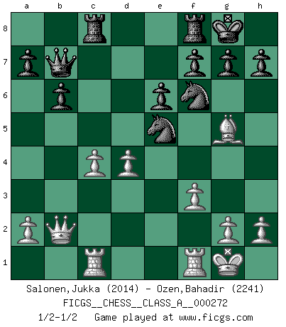 Last move : 1/2-1/2 2023 September 5 14:30:54 [Event "FICGS__CHESS__CLASS_A__000272"] [Site "FICGS"] [Date "2023.08.10"] [Round "1"] [White "Salonen,Jukka"] [Black "Ozen,Bahadir"] [Result "1/2-1/2"] [WhiteElo "2014"] [BlackElo "2241"] 1.d4 Nf6 2.c4 e6 3.Nf3 d5 4.Nc3 Bb4 5.e3 O-O 6.Bd3 dxc4 7.Bxc4 c5 8.O-O cxd4 9.exd4 b6 10.Qb3 Bxc3 11.bxc3 Nc6 12.Bd3 Bb7 13.Qb1 Rc8 14.Bd2 Nb8 15.Ne5 Qd5 16.f3 Ba6 17.Bxa6 Nxa6 18.Qb2 Nb8 19.c4 Qb7 20.Rac1 Nc6 21.Bg5 Nxe5 1/2-1/2 Follow this game move after move (download)Every Chess master was once a beginner. (Chernev) Den Ruhm habe ich schon, jetzt brauche ich noch das Geld. (Wilhelm Steinitz) Hasta este punto, las blancas han seguido un análisis bien conocido. Pero ahora el hace un error fatal: empieza a usar su propia cabeza. (Siegbert Tarrasch) On peut tirer plus d'utilité d'une partie perdue que de 100 parties gagnées. (Capablanca) There are two major products that came out of Berkeley: LSD and UNIX. We do not believe this is to be a coincidence. (Jeremy S. Anderson)