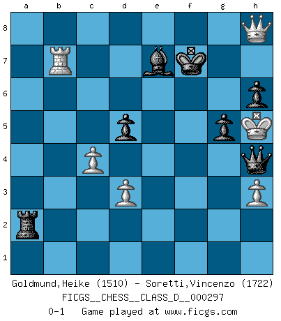 Last move : 0-1 2023 November 29 17:14:57 [Event "FICGS__CHESS__CLASS_D__000297"] [Site "FICGS"] [Date "2023.08.10"] [Round "1"] [White "Goldmund,Heike"] [Black "Soretti,Vincenzo"] [Result "0-1"] [WhiteElo "1510"] [BlackElo "1722"] 1.b4 Nf6 2.Bb2 d6 3.e3 e5 4.c4 Be7 5.Nf3 O-O 6.Be2 a6 7.O-O c6 8.d3 Nbd7 9.Nbd2 Re8 10.a3 Nf8 11.Qc2 Ng6 12.Rfd1 Bg4 13.h3 Bxf3 14.Nxf3 h6 15.Bf1 Nh7 16.a4 Ng5 17.Nh2 f5 18.f4 Nf7 19.Nf3 Qb6 20.b5 Qxe3+ 21.Kh1 Qxf4 22.Qf2 Nh4 23.Kg1 Ng5 24.Bc1 Nhxf3+ 25.gxf3 Qxf3 26.Qxf3 Nxf3+ 27.Kg2 Nh4+ 28.Kg3 g5 29.Bd2 f4+ 30.Kg4 Bf6 31.Bb4 d5 32.Rac1 axb5 33.axb5 Ra2 34.Bd6 Ng2 35.Bxg2 Rxg2+ 36.Kf5 Kf7 37.Ra1 e4 38.Ra7 e3 39.Rxb7+ Re7 40.Bxe7 Bxe7 41.bxc6 Ra2 42.c7 e2 43.Re1 f3 44.c8Q f2 45.Qh8 f1Q+ 46.Rxf1 exf1Q+ 47.Kg4 Qf4+ 48.Kh5 Qh4+ 0-1 Follow this game move after move (download)I guess a certain amount of temperament is expected of Chess geniuses. (Ron Gross) Schach verlangt totale Konzentration. (Robert James Fischer) La enorme capacidad mental, en la que sin ella no puede un jugador de Ajedrez existir, es demasiado requerida por el Ajedrez al grado de que nunca podrá liberar su mente de este juego. (Albert Einstein) La vérité est comme le meilleur coup aux échecs : elle existe, mais il faut la chercher. (Arturo Perez-Reverte) Now the reason the enlightened prince and the wise general conquer the enemy whenever they move and their achievements surpass those of ordinary men is foreknowledge. (Sun Tzu)