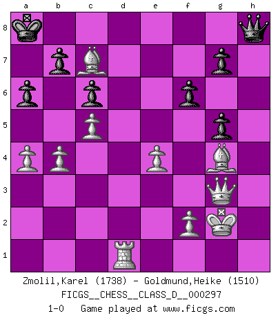 Last move : 1-0 2023 September 20 12:30:13 [Event "FICGS__CHESS__CLASS_D__000297"] [Site "FICGS"] [Date "2023.08.10"] [Round "1"] [White "Zmolil,Karel"] [Black "Goldmund,Heike"] [Result "1-0"] [WhiteElo "1738"] [BlackElo "1510"] 1.e4 d5 2.exd5 Qxd5 3.Nc3 Qa5 4.d3 Nf6 5.Bd2 c6 6.h3 Bf5 7.Nf3 e6 8.Be2 Qc7 9.O-O Bd6 10.Re1 Nbd7 11.Nh4 Bg6 12.Nxg6 hxg6 13.Ne4 Nxe4 14.dxe4 O-O-O 15.c4 Nc5 16.Qc2 f6 17.b4 Nd7 18.c5 Be5 19.Bc3 Bh2+ 20.Kh1 Bf4 21.Qa4 Kb8 22.Qb3 Ne5 23.Rad1 Rhe8 24.a4 Rxd1 25.Rxd1 Rh8 26.Qxe6 g5 27.g3 Rxh3+ 28.Qxh3 Bxg3 29.Qxg3 Qc8 30.Bxe5+ Ka8 31.Bg4 Qh8+ 32.Kg2 a6 33.Bc7 1-0 Follow this game move after move (download)I have never in my life played the French Defence, which is the dullest of all openings. (Wilhelm Steinitz) Das typische an einem Großmeister ist, daß er eine gewonnene Position schnell und schmerzlos gewinnt. (Irving Chernev) Aquellos que dicen que entienden al Ajedrez, no entienden nada. (Robert Hubner) A chaque perte on perd un peu de soi. (Joël Lautier) A computer lets you make more mistakes faster than any invention in human history - with the possible exceptions of handguns and tequila. (Mitch Ratcliffe)