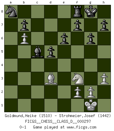 Last move : 0-1 2023 November 28 19:44:10 [Event "FICGS__CHESS__CLASS_D__000297"] [Site "FICGS"] [Date "2023.08.10"] [Round "1"] [White "Goldmund,Heike"] [Black "Strohmeier,Josef"] [Result "0-1"] [WhiteElo "1510"] [BlackElo "1442"] 1.b4 d5 2.Bb2 Nf6 3.e3 e6 4.a3 c5 5.b5 Be7 6.Nf3 O-O 7.c4 Nbd7 8.Qb3 Nb6 9.Be2 a6 10.d3 Bd7 11.a4 axb5 12.axb5 Rxa1 13.Bxa1 Qc7 14.Be5 Qc8 15.O-O Ne8 16.Nc3 Bf6 17.Rd1 Bxe5 18.d4 cxd4 19.exd4 Bf6 20.c5 Na8 21.Ra1 g6 22.h3 Bg7 23.b6 Nf6 24.Nb5 Bxb5 25.Qxb5 Ne4 26.Bd3 Nxc5 27.dxc5 Bxa1 28.Qa5 Bf6 29.Qb4 Be7 30.Qb5 Qxc5 31.Qxc5 Bxc5 0-1 Follow this game move after move (download)Man is a frivolous, a specious creature, and like a Chess player, cares more for the process of attaining his goal than for the goal itself. (Dostoyevsky) Es ist wirklich schade, dass so viele Schachspieler nicht auf ihr Äußeres achten! (Alexandra Kosteniuk) ¿Quién es tu oponente esta tarde? Esta tarde mi oponente son las piezas negras. (Akiba Rubinstein) Il vaut mieux sacrifier les pièces de l'adversaire. (Xavier Tartacover) I would love to change the world, but they won't give me the source code. (Unknown)