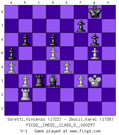 Last move : 0-1 2023 September 9 9:57:26 [Event "FICGS__CHESS__CLASS_D__000297"] [Site "FICGS"] [Date "2023.08.10"] [Round "1"] [White "Soretti,Vincenzo"] [Black "Zmolil,Karel"] [Result "0-1"] [WhiteElo "1722"] [BlackElo "1738"] 1.e4 e5 2.Nf3 Nc6 3.d4 exd4 4.Nxd4 Nxd4 5.Qxd4 d6 6.c4 Qf6 7.Qe3 g6 8.Nc3 c6 9.Be2 h5 10.Nd5 cxd5 11.cxd5 Bh6 12.Qb3 Qe7 13.Bxh6 Nxh6 14.Qe3 Qe5 15.Rb1 Ng4 16.Bxg4 Bxg4 17.O-O b6 18.Rbc1 Rc8 19.Rxc8+ Bxc8 20.Rc1 O-O 21.Rc2 Qe7 22.f3 Bb7 23.Re2 Rc8 24.g3 Ba6 25.Rf2 Qc7 26.Kg2 Qc5 27.Qh6 Qd4 28.g4 hxg4 29.Qf4 Qe5 30.Qxg4 Rc7 31.h4 Bc8 32.Qg5 Qxg5+ 33.hxg5 a5 34.a4 Rc4 35.b3 Rc3 36.Rb2 Ba6 37.Kg3 Bd3 0-1 Follow this game move after move (download)The isolated Pawn casts gloom over the entire chessboard. (Aaron Nimzovich) Der Verteidiger gebe der Gewalt nach, aber nur der Gewalt. Er schaffe sich nicht freiwillig, etwa aus Blindheit oder aus Schrecken, irgendwelche Schwächen. Er lasse sich nicht bluffen. (Emanuel Lasker) El ganar no lo es todo... pero el perder es nada. (Mednis) C'est une question de caractère, Beaucoup de gens perdent leur motivation très vite. D'autres, ils sont rares, peuvent la conserver très longtemps. J'aime les échecs, encore aujourd'hui je suis heureux d'analyser des parties. J'aime toujours gagner, je déteste encore perdre. Bien jouer est important pour mon intégrité intellectuelle et morale. Et puis les échecs vivent en ce moment une période historique grâce à Internet. Ils se développent dans les systèmes éducatifs à travers le monde. Ils sortent de leur ghetto, et c'est mon rôle de mener à bien cette révolution. (Gary Kasparov) War is the child of passion, passion is the child of narcissism and narcissism is the child. (...) Another game ? (Thibault de Vassal)