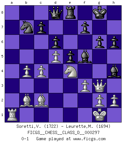 Last move : 0-1 2023 September 4 12:14:47 [Event "FICGS__CHESS__CLASS_D__000297"] [Site "FICGS"] [Date "2023.08.10"] [Round "1"] [White "Soretti,Vincenzo"] [Black "Leurette,Marc-Antoine"] [Result "0-1"] [WhiteElo "1722"] [BlackElo "1694"] 1.e4 e5 2.Nf3 Nc6 3.Bc4 Nf6 4.d3 d6 5.O-O Be7 6.a3 O-O 7.Nc3 h6 8.Nd5 Nxd5 9.exd5 Na5 10.Ba2 b6 11.b4 Nb7 12.c4 Bd7 13.Bb3 a6 14.Re1 Bf6 15.Rb1 Re8 16.Bc2 a5 17.Bb2 b5 18.Nd2 axb4 19.axb4 bxc4 20.dxc4 Qc8 21.Ne4 Be7 22.Qd3 g6 23.Qg3 Bf5 24.f3 Qd8 25.Ra1 Rxa1 26.Rxa1 Bh4 0-1 Follow this game move after move (download)My opponents make good moves too. Sometimes I don't take these things into consideration. (Bobby Fischer) Es gibt keine einzige Frau, der ich nicht einen Springer vorgeben könnte und trotzdem gewänne. (Robert James Fischer) Algunos sacrificios son sólidos, los demás son míos. (Mikhail Tal) Tous ces prétendus hommes politiques sont les pions, les Cavaliers, les Tours ou les Fous d'une partie d'échecs qui se jouera tant qu'un hasard ne renversera pas l'échiquier. (Honoré de Balzac) Never was anything great achieved without danger. (Niccolo Machiavelli)
