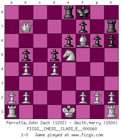 Last move : 1-0 2007 November 19 1:35:44 [Event "FICGS__CHESS__CLASS_E__000060"] [Site "FICGS"] [Date "2007.09.05"] [Round "1"] [White "Perrotta,John Zach"] [Black "Smith,Harry"] [Result "1-0"] [WhiteElo "1202"] [BlackElo "1500"] 1.e4 c6 2.d4 d5 3.Nc3 e6 4.Nf3 Ne7 5.Bg5 Qd7 6.Bd3 h6 7.Bh4 g6 8.Ne5 Qc7 9.Qf3 Ng8 10.exd5 Rh7 11.Qf4 cxd5 12.Bb5+ Nc6 13.Nxc6 a6 14.Qxc7 Nf6 15.Bxf6 Bd7 16.Ne5 Bxb5 17.Nxb5 Bb4+ 18.c3 axb5 19.Qd7+ Kf8 20.Qxb7 Re8 21.cxb4 1-0 Caro-Kann defense Player White won this chess game. Follow this game move after move (download)The mistakes are there, waiting to be made. (Savielly Tartakower) Sitze auf Deine Hände. (Siegbert Tarrasch) Los Peones son nacidos libres, y aún así, se encuentran por doquier encadenados. (Rick Kennedy) Les échecs, c'est la lutte contre l'erreur. (Johannes Zukertort) At last I discovered the true beauty of chess. So I proposed to her. (Dinesh De Silva)