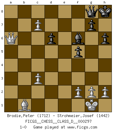 Last move : 1-0 2024 April 1 23:15:7 [Event "FICGS__CHESS__CLASS_D__000297"] [Site "FICGS"] [Date "2023.08.10"] [Round "1"] [White "Brodie,Peter"] [Black "Strohmeier,Josef"] [Result "1-0"] [WhiteElo "1712"] [BlackElo "1442"] 1.e4 c5 2.Bc4 Nc6 3.Nf3 e6 4.Nc3 a6 5.d3 b5 6.Bb3 d6 7.O-O Qc7 8.a3 Be7 9.Bf4 Nf6 10.Qd2 O-O 11.Rae1 e5 12.Be3 b4 13.Nd5 Nxd5 14.exd5 Na5 15.Ba2 Rb8 16.axb4 Rxb4 17.c3 Rb8 18.b4 Nb7 19.Rb1 Bg4 20.Ne1 Bd7 21.bxc5 Nxc5 22.Bxc5 Qxc5 23.Nf3 f5 24.Rxb8 Rxb8 25.Nxe5 Be8 26.d4 Qc7 27.Nc6 Bxc6 28.dxc6 Kh8 29.Re1 h6 30.d5 Bf6 31.Rb1 Rxb1+ 32.Bxb1 Qa5 33.Qe2 Qxd5 34.c7 Qg8 35.Qxa6 1-0 Follow this game move after move (download)Chess, like love, is infectious at any age. (Flohr) Je mehr wir mit Computern analysieren, desto mehr glauben wir an Verteidigung. (Vladimir Kramnik) Un entendimiento minucioso de las típicas continuaciones de mate hacen de las mas complicadas combinaciones de sacrificio que conducen hacia ellas no solo no dificiles, sino casi un asunto de rutina. (Siegbert Tarrasch) C'est la seule position que je connaisse où les deux camps sont mals. Propos prêtés à V. Anand. All the biggest technological inventions created by man - the airplane, the automobile, the computer - says little about his intelligence, but speaks volumes about his laziness. (Mark Kennedy)
