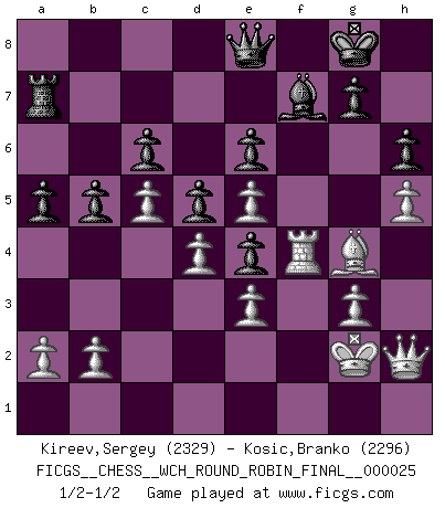 Last move : 1/2-1/2 2023 September 29 11:31:38 [Event "FICGS__CHESS__WCH_ROUND_ROBIN_FINAL__000025"] [Site "FICGS"] [Date "2023.08.13"] [Round "1"] [White "Kireev,Sergey"] [Black "Kosic,Branko"] [Result "1/2-1/2"] [WhiteElo "2329"] [BlackElo "2296"] 1.d4 e6 2.c4 f5 3.g3 Nf6 4.Nf3 Be7 5.Nc3 O-O 6.Bg2 d5 7.O-O c6 8.Qc2 Ne4 9.Bf4 Nd7 10.Rad1 a5 11.Nxe4 fxe4 12.Ne5 Bg5 13.Bxg5 Qxg5 14.h4 Qe7 15.f4 Nxe5 16.fxe5 Bd7 17.c5 Rxf1+ 18.Rxf1 Rb8 19.Bh3 b6 20.Qb3 b5 21.Qc3 Ra8 22.Bg4 Be8 23.Qd2 h6 24.e3 Bg6 25.h5 Bf7 26.Rf4 Qe8 27.Qh2 Ra7 28.Kg2 1/2-1/2 Follow this game move after move (download)When I have White, I win because I am white; When I have Black, I win because I am Bogolyubov. (Bogolyubov) Die Auseinandersetzung mit Karpow war politisch geprägt. Er stand für das kommunistische System, wurde von dessen Repräsentanten gehätschelt. Ich war der Oppositionelle. Jeder Schachweltmeister spiegelt auch die gesellschaftlichen Verhältnisse wider. Kramnik steht für die Börsen-Generation des Neuen Markts, ideologiefrei, zahlenfixiert. (Garry Kasparov) Cuando estes solo, cuando te sientas un extraño en el mundo, juega al Ajedrez. Esto levantará tu espiritu y será tu consejero de guerra. (Aristóteles) C'est la seule position que je connaisse où les deux camps sont mals. Propos prêtés à V. Anand. The best teachers teach from the heart, not from the book. (Author unknown)