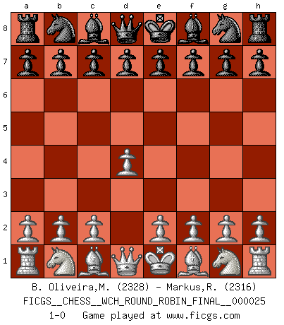 Last move : 1-0 2023 September 13 0:34:24 [Event "FICGS__CHESS__WCH_ROUND_ROBIN_FINAL__000025"] [Site "FICGS"] [Date "2023.08.13"] [Round "1"] [White "B. Oliveira,Marcio"] [Black "Markus,Roland"] [Result "1-0"] [WhiteElo "2328"] [BlackElo "2316"] 1.d4 1-0 This chess game has been lost on time (started : 2023.08.13 2:3:21) Follow this game move after move (download)Chess holds its master in its own bonds, shackling the mind and brain so that the inner freedom of the very strongest must suffer. (Albert Einstein) Pläne sind die Träume des Verständigen. (Ernst Freiherr von Feuchtersleben) El estómago es una parte esencial del maestro de Ajedrez. (Bent Larsen) Il vaut mieux sacrifier les pièces de l'adversaire. (Xavier Tartacover) Now you put water in a cup, it becomes the cup; You put water into a bottle it becomes the bottle; You put it in a teapot it becomes the teapot. Water can flow or it can crash. Be water, my friend. (Bruce Lee)