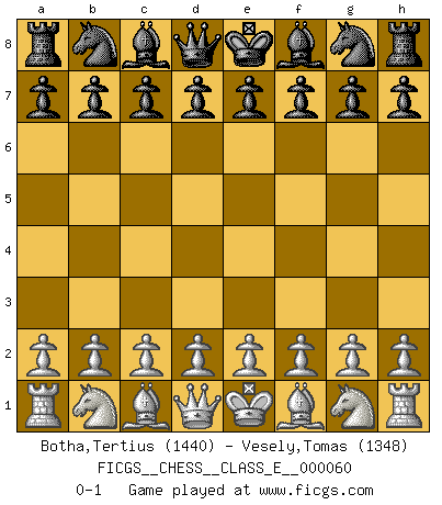 Last move : 0-1 2007 October 15 6:42:0 [Event "FICGS__CHESS__CLASS_E__000060"] [Site "FICGS"] [Date "2007.09.05"] [Round "1"] [White "Botha,Tertius"] [Black "Vesely,Tomas"] [Result "0-1"] [WhiteElo "1440"] [BlackElo "1348"] 0-1 This chess game has been lost on time (started : 2007.09.05 3:38:10) Player Black won this chess game. Follow this game move after move (download)The battle for the ultimate truth will never be won. And that's why Chess is so fascinating. (Hans Kmoch) Bobby Fischer ist kein Vorbild für die heutige Jugend. (Viktor Kortschnoi) El Ajedrez, como la música, como el amor, tiene el poder de hacer feliz a la gente. (Siegbert Tarrasch) Un millionnaire : 'Monsieur Steinitz ! Vous ne participez aux tournois que pour l'argent, alors que moi je n'y viens que pour l'honneur.' Steinitz : 'Chacun joue pour ce qu'il n'a pas'... If you are going through hell, keep going. (Winston Churchill)