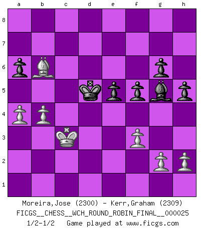 Last move : 1/2-1/2 2023 November 4 2:43:40 [Event "FICGS__CHESS__WCH_ROUND_ROBIN_FINAL__000025"] [Site "FICGS"] [Date "2023.08.13"] [Round "1"] [White "Moreira,Jose"] [Black "Kerr,Graham"] [Result "1/2-1/2"] [WhiteElo "2300"] [BlackElo "2309"] 1.e4 c5 2.Nf3 d6 3.d4 cxd4 4.Nxd4 Nf6 5.Nc3 a6 6.f3 e5 7.Nb3 Be6 8.Be3 h5 9.Nd5 Bxd5 10.exd5 g6 11.Qd2 Nbd7 12.Be2 Bg7 13.O-O b6 14.Kh1 O-O 15.Rad1 b5 16.Na5 Nb6 17.c4 bxc4 18.Bxc4 Nxc4 19.Nxc4 Rb8 20.Bg5 Qd7 21.Qa5 Qb5 22.Qxb5 Rxb5 23.b3 Nxd5 24.Nxd6 Ra5 25.Nc4 Rc5 26.Kg1 f6 27.Bc1 Rfc8 28.Nd6 R8c6 29.Ba3 Ra5 30.Nc4 Rb5 31.Rd3 Nb6 32.Rd8+ Kh7 33.Rc1 Rd5 34.Rxd5 Nxd5 35.Ne3 Rxc1+ 36.Bxc1 Nxe3 37.Bxe3 Kg8 38.a4 Bf8 39.Kf2 Kf7 40.Ke2 Ke6 41.Kd3 Kd5 42.Kc3 f5 43.b4 Be7 44.Bb6 Bf6 45.Kb3 Bg5 46.Kc3 1/2-1/2 Follow this game move after move (download)A player surprised is half beaten. (Proverb) Dass jemand wie Surab Asmaiparaschwili, der selbst Elopunkte gekauft hat , Vize-Präsident der Fide werden konnte, sagt schon einges über den Zustand dieser Organisation aus. (Joel Lautier) Nunca nadie ha ganado una partida de Ajedrez rindiendose. (Unknown) La menace est plus forte que l'exécution. (Aaron Nimzovitch) The absolute truth is the thing that makes people laugh. (Carl Reiner)
