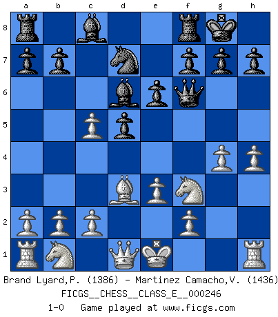 Last move : 1-0 2023 September 29 16:40:35 [Event "FICGS__CHESS__CLASS_E__000246"] [Site "FICGS"] [Date "2023.08.13"] [Round "1"] [White "Brand Lyard,Paul"] [Black "Martinez Camacho,Victor Hugo"] [Result "1-0"] [WhiteElo "1386"] [BlackElo "1436"] 1.d4 Nf6 2.Bg5 e6 3.Bxf6 Qxf6 4.e3 d5 5.Bb5+ c6 6.Bd3 Bd6 7.Nf3 O-O 8.h4 Nd7 9.g4 c5 10.dxc5 1-0 This chess game has been lost on time (started : 2023.08.13 7:40:36) Follow this game move after move (download)One of these modest little moves may be more embarrassing to your opponent than the biggest threat. (Siegbert Tarrasch) Kein Großmeister ist normal. Sie unterscheiden sich nur im Ausmaß Ihrer Verrücktheit. (Viktor Kortschnoi) No es suficiente ser un buen jugador, se debe también de jugar bién. (Siegbert Tarrasch) Les échecs sont un jeu par leur forme, un art par leur essence et une science par sa difficulté d'acquisition. Ils peuvent vous procurer autant de plaisir qu'un bon livre ou une belle musique, mais vous n'aurez une réelle joie que si vous arrivez à bien jouer. (Tigran Petrosian) There are two types of people in this world, good and bad. The good sleep better, but the bad seem to enjoy the waking hours much more. (Woody Allen)