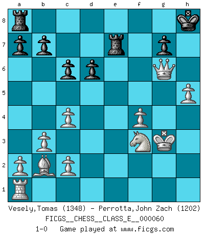 Last move : 1-0 2007 December 13 16:10:10 [Event "FICGS__CHESS__CLASS_E__000060"] [Site "FICGS"] [Date "2007.09.05"] [Round "1"] [White "Vesely,Tomas"] [Black "Perrotta,John Zach"] [Result "1-0"] [WhiteElo "1348"] [BlackElo "1202"] 1.e4 e5 2.Nf3 Nc6 3.Nc3 Bc5 4.Bc4 Nf6 5.d3 O-O 6.b3 d6 7.Bb2 Bg4 8.Nd5 Na5 9.h3 Bh5 10.O-O Nxc4 11.dxc4 Nxe4 12.Qd3 Ng3 13.Rfe1 e4 14.Rxe4 Nxe4 15.Qxe4 Bg6 16.Ne7+ Kh8 17.Nxg6+ hxg6 18.h4 Re8 19.Qd5 c6 20.Qxf7 Qe7 21.Qxg6 Bxf2+ 22.Kh2 Qf8 23.h5 Qf4+ 24.g3 Re7 25.gxf4 Bg3+ 26.Kxg3 1-0 Three knights game Kingside Castling by player Black (move 5) Kingside Castling by player White (move 10) Player White won this chess game. Follow this game move after move (download)A player surprised is half beaten. (Proverb) Gott hat gewollt, dass ich Champion werde. (Surab Azmajparaschvili) No es una movida, aún la mejor movida que tu debas buscar, sino un plan comprensible. (Eugene Znosko-Borovsky) A chaque perte on perd un peu de soi. (Joël Lautier) Establishing goals is all right if you don't let them deprive you of interesting detours. (Doug Larson)