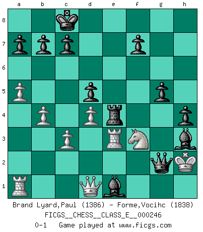 Last move : 0-1 2023 November 2 19:28:2 [Event "FICGS__CHESS__CLASS_E__000246"] [Site "FICGS"] [Date "2023.08.13"] [Round "1"] [White "Brand Lyard,Paul"] [Black "Forme,Vocihc"] [Result "0-1"] [WhiteElo "1386"] [BlackElo "1838"] 1.d4 Nf6 2.Bg5 d5 3.Bxf6 exf6 4.e3 Be6 5.Bb5+ Nd7 6.Bxd7+ Qxd7 7.f4 Bb4+ 8.c3 Bd6 9.Nd2 O-O-O 10.g3 h5 11.h3 Rde8 12.b4 g5 13.a4 h4 14.g4 f5 15.gxf5 Bxf5 16.a5 Rxe3+ 17.Kf2 Bxf4 18.Ndf3 Rhe8 19.Ne5 R8xe5 20.Nf3 R5e4 21.Re1 Bg3+ 22.Kf1 Bxh3+ 23.Kg1 Qg4 24.Rxe3 Be1 25.Kh2 Qg2+ 0-1 Follow this game move after move (download)Not only will I predict his triumph over Botvinnik, but I'll go further and say that he'll probably be the greatest Chess player that ever lived. (John Collins) Spiel ein langweiliges Spiel zu Ende und lustige Dinge können passieren. (Hans Ree) El Ajedrez tiene tanto misterio como las mujeres. (Purdy) Même si vous avez un bon coup à faire, regardez toujours s'il n'y en a pas un qui lui soit préférable. (Pedro Damiano) Inventor: A person who makes an ingenious arrangement of wheels, levers and springs, and believes it civilization. (Ambrose Bierce, The Devil's Dictionary)