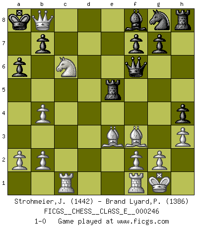 Last move : 1-0 2023 October 4 9:29:43 [Event "FICGS__CHESS__CLASS_E__000246"] [Site "FICGS"] [Date "2023.08.13"] [Round "1"] [White "Strohmeier,Josef"] [Black "Brand Lyard,Paul"] [Result "1-0"] [WhiteElo "1442"] [BlackElo "1386"] 1.e4 e5 2.Nf3 Nc6 3.Bb5 d6 4.d4 Bg4 5.h3 Bxf3 6.Qxf3 exd4 7.O-O Qf6 8.Qd3 O-O-O 9.Nd2 h5 10.Nf3 Re8 11.Nxd4 Nb4 12.Qc4 d5 13.exd5 Rd8 14.c3 Rxd5 15.Be3 Re5 16.cxb4 h4 17.Rac1 c6 18.Bxc6 Kb8 19.Bf3 a6 20.Qc7+ Ka7 21.Nc6+ Ka8 22.Qb8+ 1-0 Follow this game move after move (download)Only the player with the initiative has the right to attack. (Wilhelm Steinitz) Schach verlangt totale Konzentration. (Robert James Fischer) En un gambito tu regalas un Peón por el bién de tomar un juego perdido. (Samuel Standige Boden) Lorsque vous vous retrouvez devant une position atroce, ne tendez pas un ultime piège dérisoire avec l'intention d'abandonner si l'adversaire le déjoue ! Faites-vous plutôt un devoir de résister comme si votre vie en dépendait. Jouez le coup qui vous déplairait au centuple si vous étiez dans la peau de votre tortionnaire ! You must have a dream in order to have it come true. (A.P.J. Kalam)
