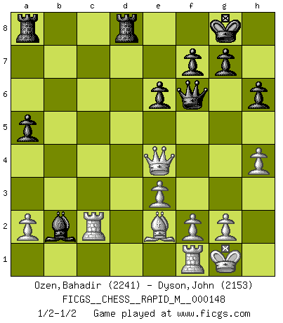 Last move : 1/2-1/2 2023 September 7 12:46:47 [Event "FICGS__CHESS__RAPID_M__000148"] [Site "FICGS"] [Date "2023.08.13"] [Round "1"] [White "Ozen,Bahadir"] [Black "Dyson,John"] [Result "1/2-1/2"] [WhiteElo "2241"] [BlackElo "2153"] 1.d4 Nf6 2.c4 e6 3.Nf3 d5 4.Nc3 Bb4 5.Bg5 h6 6.Bxf6 Qxf6 7.e3 O-O 8.Rc1 dxc4 9.Bxc4 c5 10.O-O cxd4 11.Nxd4 Bd7 12.Qb3 Nc6 13.Nxc6 Bxc3 14.Qxb7 Bxc6 15.Qxc6 Rfc8 16.Qb7 Rcb8 17.Qe4 Bxb2 18.Rc2 Rd8 19.Be2 a5 20.h4 1/2-1/2 Follow this game move after move (download)I have always a slight feeling of pity for the man who has no knowledge of Chess. (Siegbert Tarrasch) Kasparov ist eine Art Monster mit hundert Augen, denen auch nicht das Geringste entgeht. (Tony Miles) La señal de un Gran Maestro es su habilidad de ganar una partida rápidamente y sin dolor. (Irving Chernev) Le système Elo représente seulement une moyenne. Il est simplement un indicateur de votre stabilité. (Anatoli Karpov) Nothing is more important for teaching us to understand the concepts we have than constructing fictitious ones. (Ludwig Wittgenstein)
